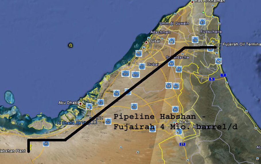 Auch die Vereinigten Arabischen Emirate (VAE) haben auf die permanente Bedrohung reagiert. In den 2010er Jahren haben die reichen Ölförderlländer am Persischen Golf selbst eine Pipeline gebaut. Sie führt von der Pumpstation Habshan im Westen Dubais quer durch die VAE und das Randgebirge im Osten an die Küste des Emirats Fujairah am Golf von Oman. Mit vier Millionen Barrel pro Tag kann die Pipeline die gesamte Ölproduktion der VAE zum Ölterminal von Fujairah transportieren.