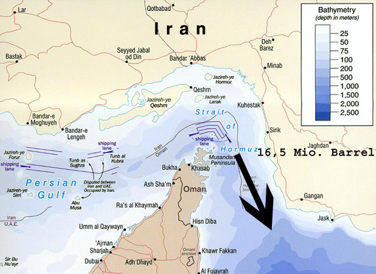 Pro Tag passieren etwa 16,5 Millionen Barrel (1 Barrel entspricht 159 Litern) Rohöl auf Tankern die Straße von Hormus. Das Öl stammt aus den Anrainerstaaten des Persischen Golfes, aus den Vereinigten Arabischen Emiraten (2 Mio. Barrel), Saudi-Arabien (8 Mio. Barrel), Kuwait (2 Mio. Barrel), Irak (2 Mio. Barrel) und Iran (2,5 Mio Barrel). Am Weltrohölbedarf von etwa 85 Millionen Barrel pro Tag stellt dies einen Anteil von mehr als 19 Prozent dar.